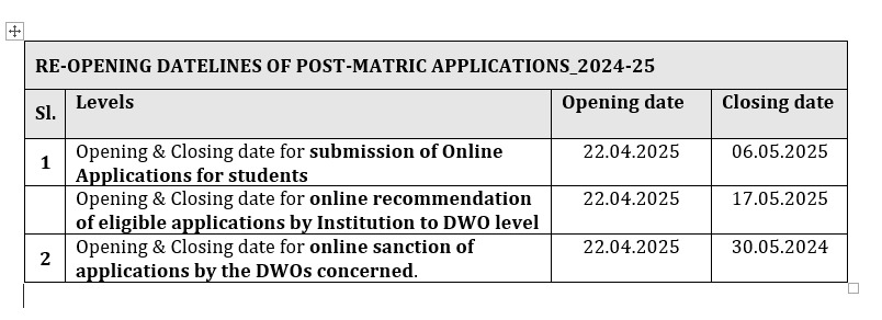 Extension of dateline under Post-Matric Scholarship (ST and SC, MBC Welfare Department ) for the AY 2024-2025