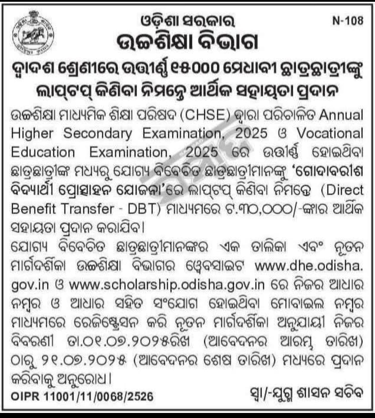 Godabarisha Vidyarthi Protsahana Yojana (LAPTOP DBT) Scheme Academic Year – 2024 and 2025